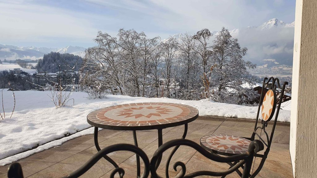 Urgemütlich und luxuriös ausgestattet bietet Blick übers Inntal, der zum Träumen und Wandern einlädt. Mit Kaminfeuer klingen die Abende romantisch aus.