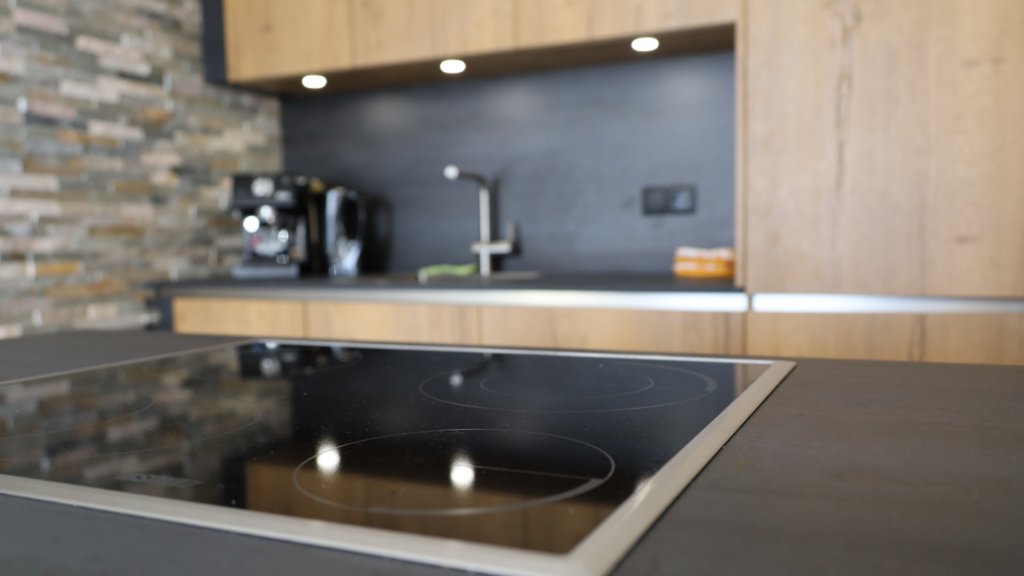 Voll ausgestattete Küche mit Kochinsel, Kühlschrank mit Eisfach, Herd, Backofen, Geschirrspüler